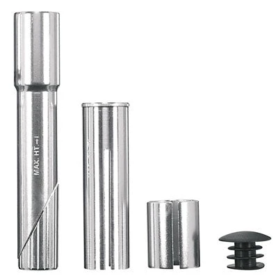L’adaptateur de potence se glisse dans le pivot de fourche fileté à la place de la potence à plongeur d’origine. Un cylindre d’épaisseur intérieur de 22.2 mm et extérieur 25.4 mm fourni permet d’adapter la taille de l’adaptateur à différents diamètres de pivot de fourche. Une seconde bague (fournie) permet d’adapter la compatibilité de l’adaptateur avec des potences de type Ahead-set de 1″ ou 25,4 mm ou de 1″1/8 ou 28,6 mm. Un bouchon en plastique permet ensuite de fermer le haut du tube et éviter ainsi que la vis du plongeur ne s’encrasse, ne se grippe ou ne s’oxyde.