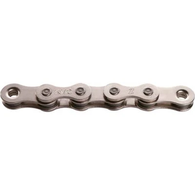 La chaîne de vélo KMC est adaptée aux singlespeed, fixies, BMX, VAE avec transmission moyeu à une vitesse. C’est une chaîne extra-longue à 128 maillons. Le pas, l’espace entre les deux axes, est de 1/2, soit 12.7 mm. Cette mesure est prise de centre à centre entre les rivets. La largeur est de 3/32 pouces soit 2.381 mm. Cette mesure est prise à l’intérieur du maillon.