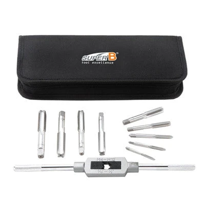 Super B a conçu un outil de taraudage TB-19000 qui est capable de refaire le filetage de plusieurs pièces vélo spécifiques comme une manivelle ou un cadre au niveau du jeu de direction. Pesant 758 g, il est facile à utiliser et vous permettra de nettoyer et fileter l’intérieur des trous où se vissent, par exemple, les manivelles. Le kit est composé d’un tourne à gauche, pièce qui porte les tarauds, disponible en plusieurs tailles.