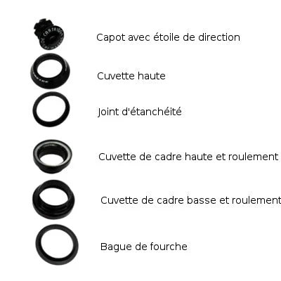 Conçu pour permettre de tourner la fourche, le jeu de direction se monte entre la douille de direction et le tube de fourche.