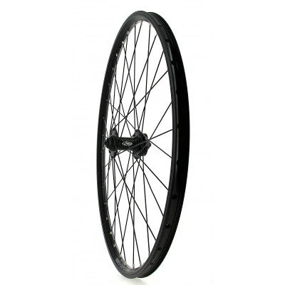 Cette roue avant est spécialement conçue pour être montée sur un vélo tout terrain de 26 pouces. Son moyeu est spécialement conçu pour y fixer un disque de frein. Pour installer votre disque de frein, 6 vis M5 de 10 mm vous sont proposées en option. Si besoin, des disques de frein sont disponibles. Tous les éléments de roue (jante, moyeu et rayons) sont noirs. Son moyeu est en aluminium et il est livré avec son axe à serrage rapide. L’entraxe mesure 100 mm. La roue montée pèse 1120 grammes.