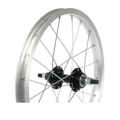 Avec sa jante à paroi simple large de 21 mm, la roue arrière de couleur argent est équipée d’un moyeu 16 trous et de son axe à boulons en aluminium et acier. Un filetage est présent pour y installer une roue libre. La roue a une ETRTO est de 21-203. Il est possible d’y installer des pneus 12 pouces ayant une ETRTO comprise entre 35-203 et 62-203 comme le pneu tringles souples 12 pouces ou le pneu tringles rigides avec crampons. Un article complet sur les dimensions des pneus vélo est proposé sur notre blog Citycle.