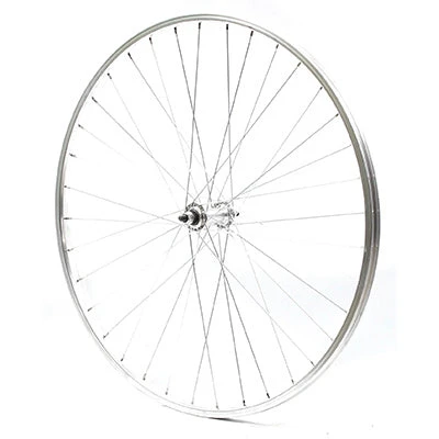 La roue avant équipe les vélos VTT de 26 pouces. La jante a les caractéristiques suivantes : une largeur interne de 21 mm et un diamètre interne de 559 mm. Soit, un ETRTO de 21-559. Concernant le moyeu, l’axe de la roue se monte à l’aide d’écrous et son entraxe mesure 100 mm. Le moyeu est de couleur argent.