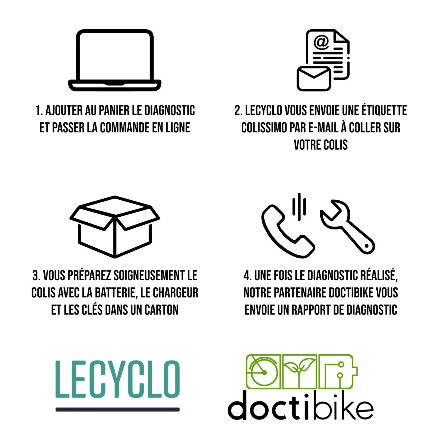 Combien de temps faut-il compter pour un diagnostic Doctibike ? Il faut compter environ 10 jours d’immobilisation de votre batterie avec le transport entre chez vous et l’atelier Doctibike inclus.