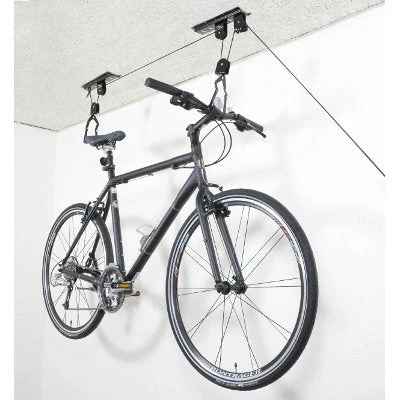 Gagnez de la place et rangez votre vélo en hauteur grâce au support de vélo pour plafond. Les deux crochets recouverts d’une gaine de protection en plastique noir viennent prendre le vélo au niveau du guidon et de la selle du vélo.