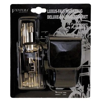 Grâce à ses 18 fonctions, ce kit d’outils de luxe pliant pour vélo permet d’effectuer la plupart des réparations sur un vélo. Fourni avec une pochette qui peut être accrochée à la ceinture ou dans une sacoche de selle, il est très facilement transportable et peu encombrant.