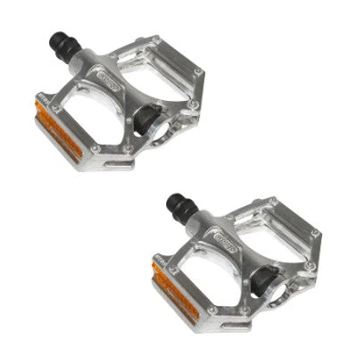 Ces pédales argent conviennent pour le VTT et la pratique sportive en descente. Les 6 crampons métalliques, sur chacune des faces de la pédale, évitent que le pied ne glisse ou dérape. La plateforme est large et mesure 75x95mm, l’ensemble de la pédale mesure 100 x 100 x26,2mm.